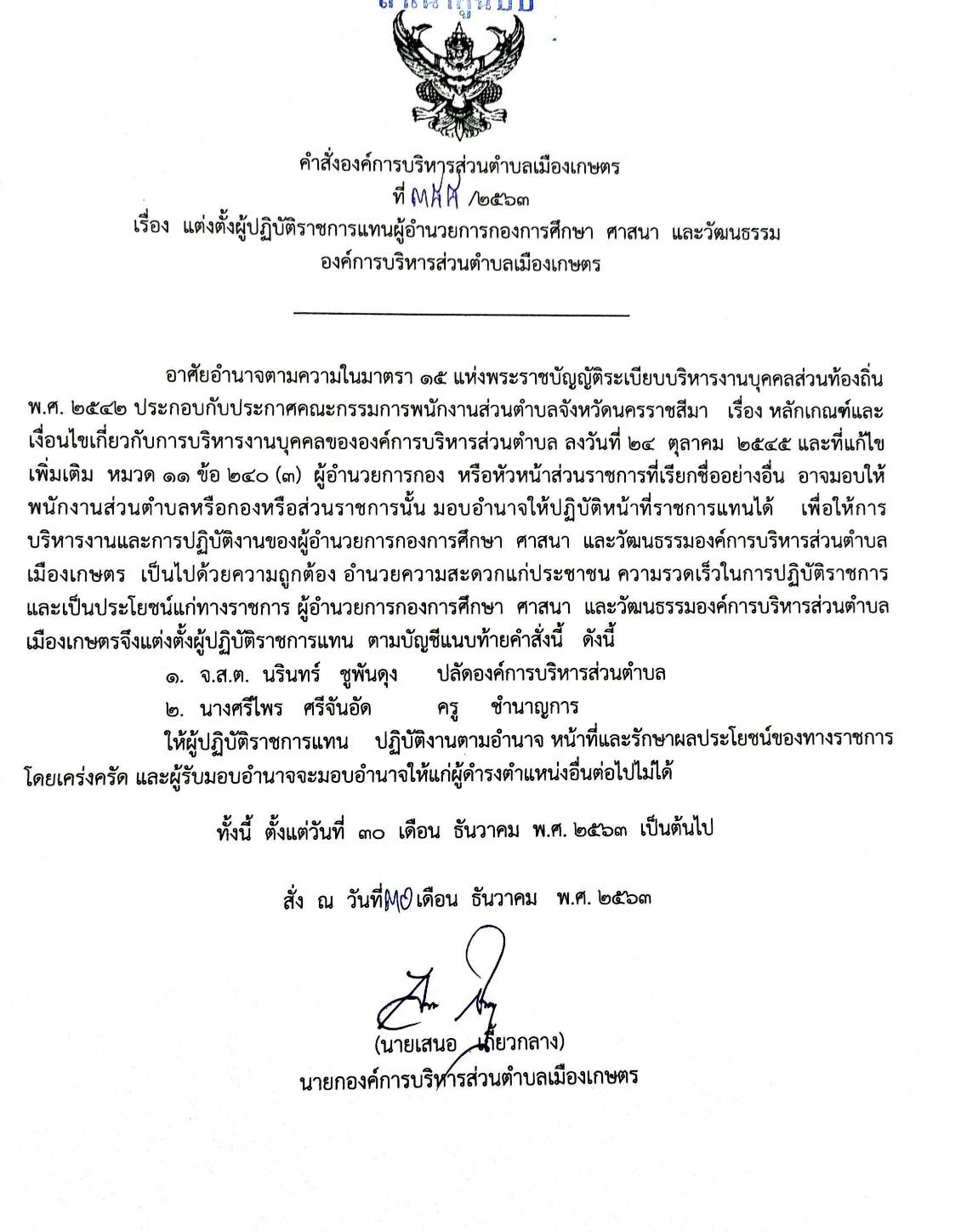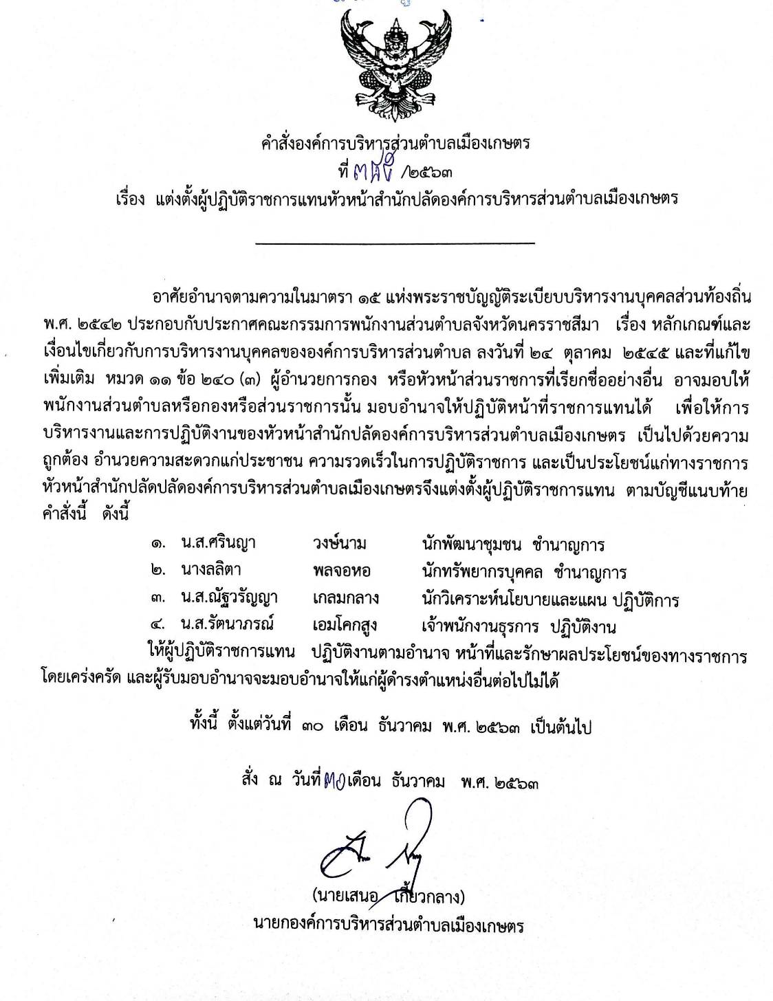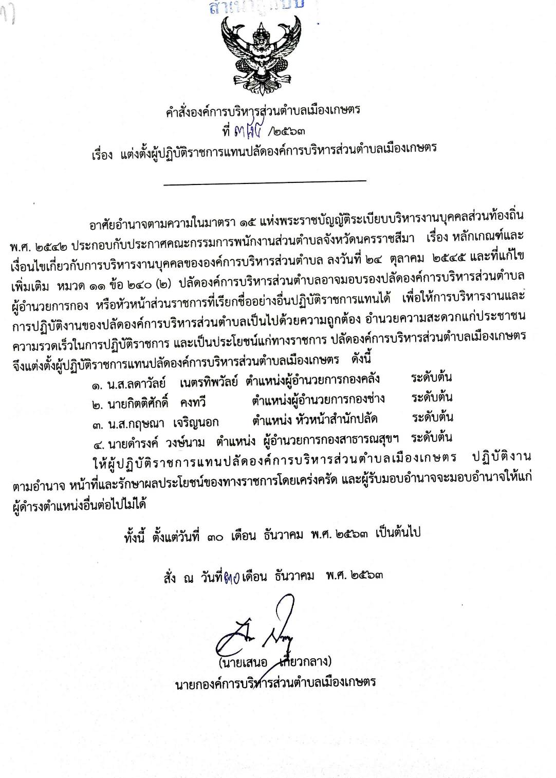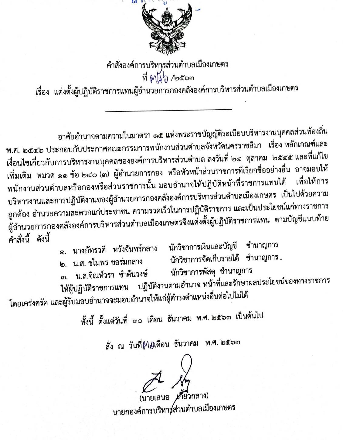 ประชาสัมพันธ์การมอบอำนาจปฏิบัติราชการและรักษาราชการแทนภายใน อบต.เมืองเกษตร