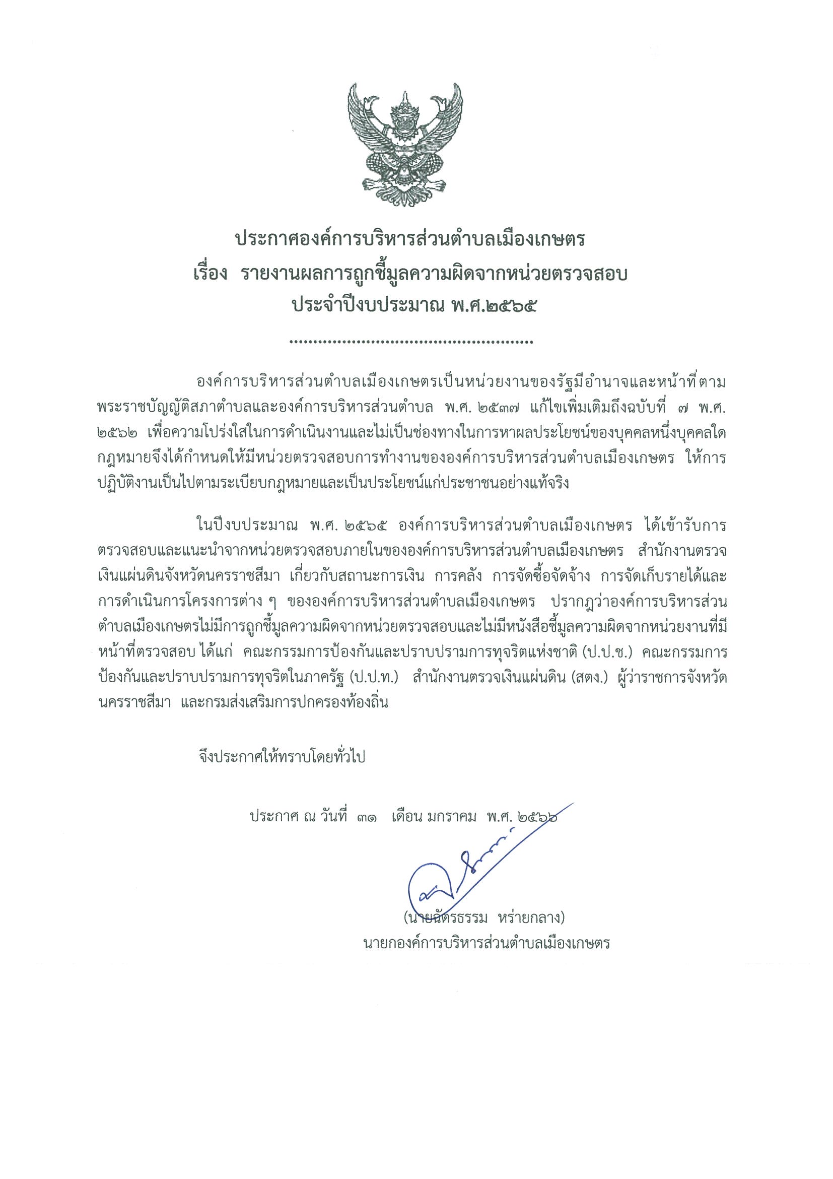 รายงานผลการถูกชี้มูลความผิดจากหน่วยตรวจสอบ ประจำปีงบประมาณ พ.ศ. 2565
