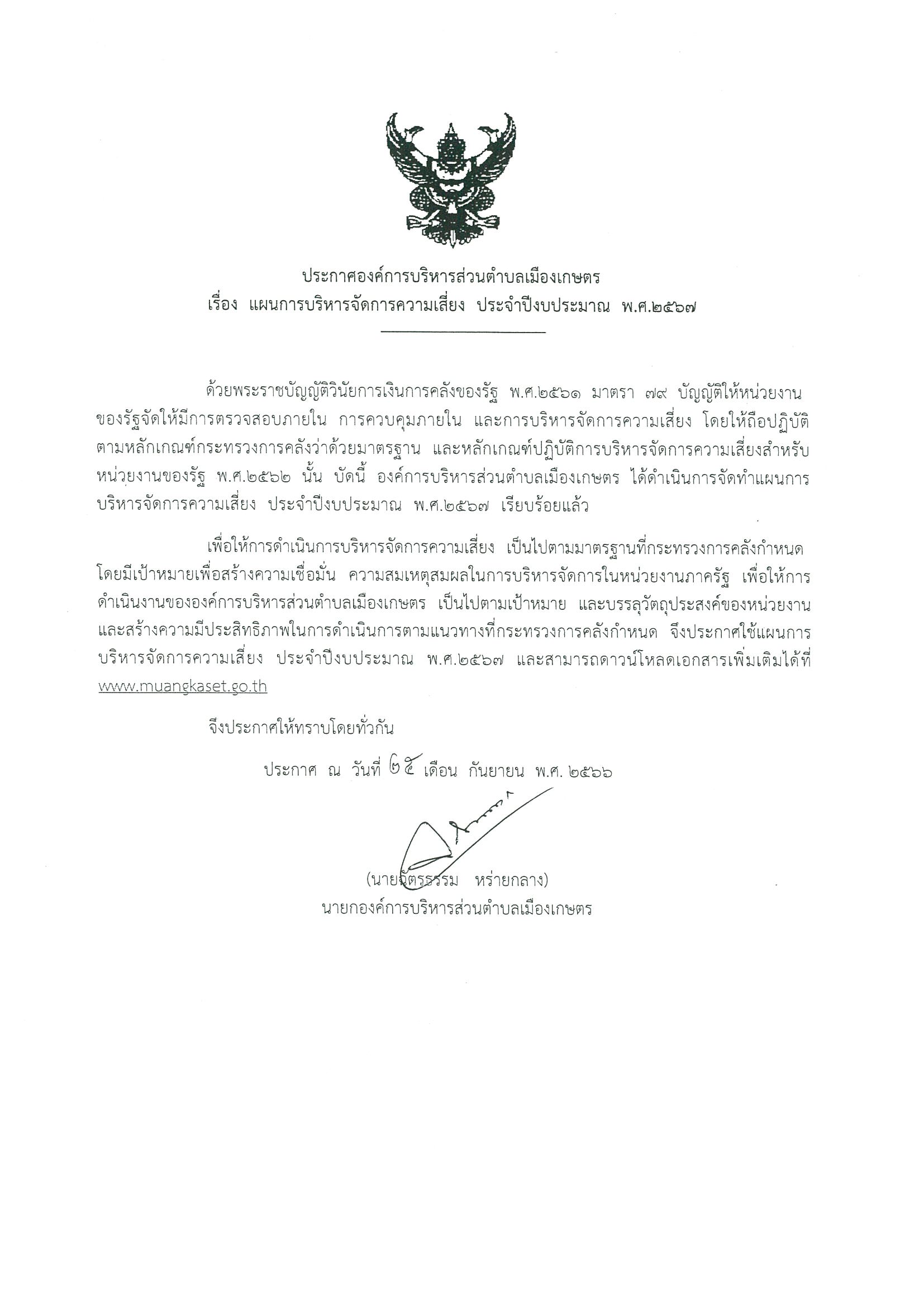 ประกาศ แผนการบริหารจัดการความเสี่ยง ปี 2567