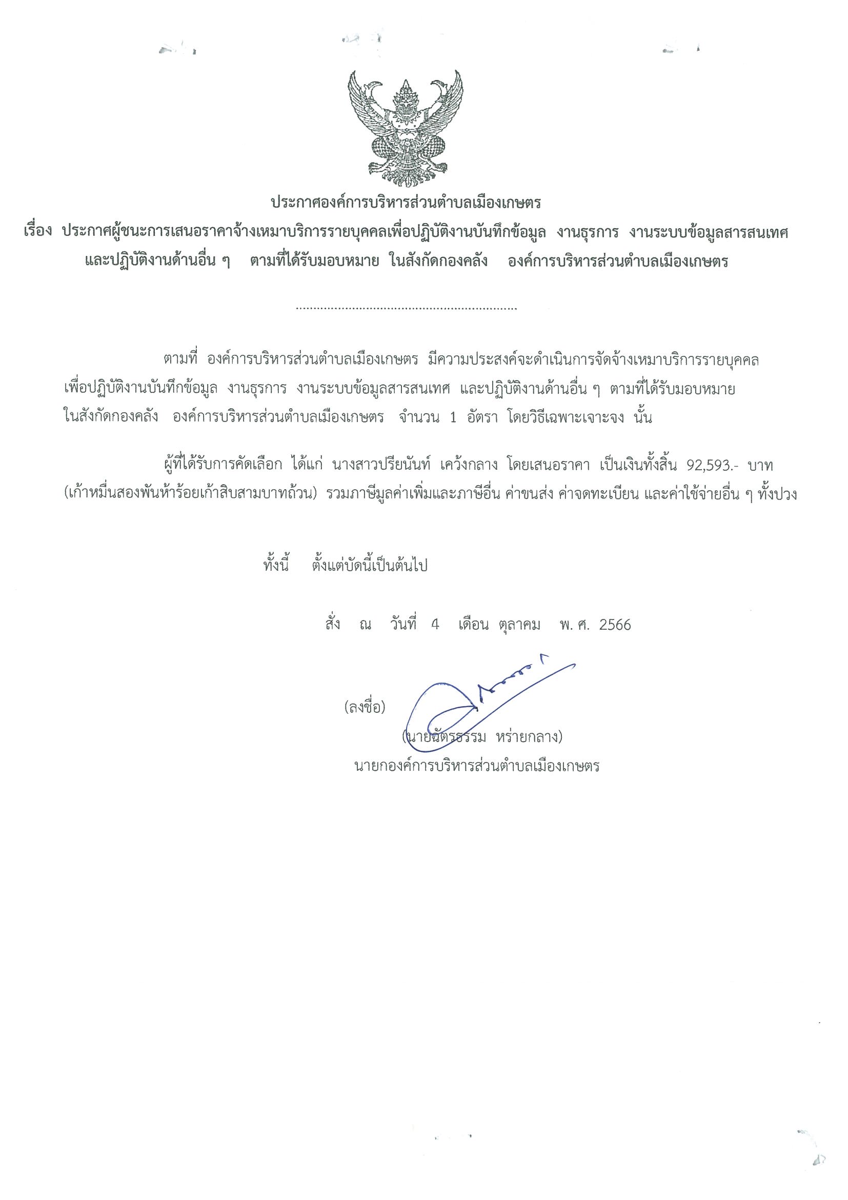 ประกาศผู้ชนะเสนอราคาจ้างเหมาบริการรายบุคคลเพื่อปฏิบัติงานบันทึกข้อมูล งานธุรการ ในสังกัดกองคลัง