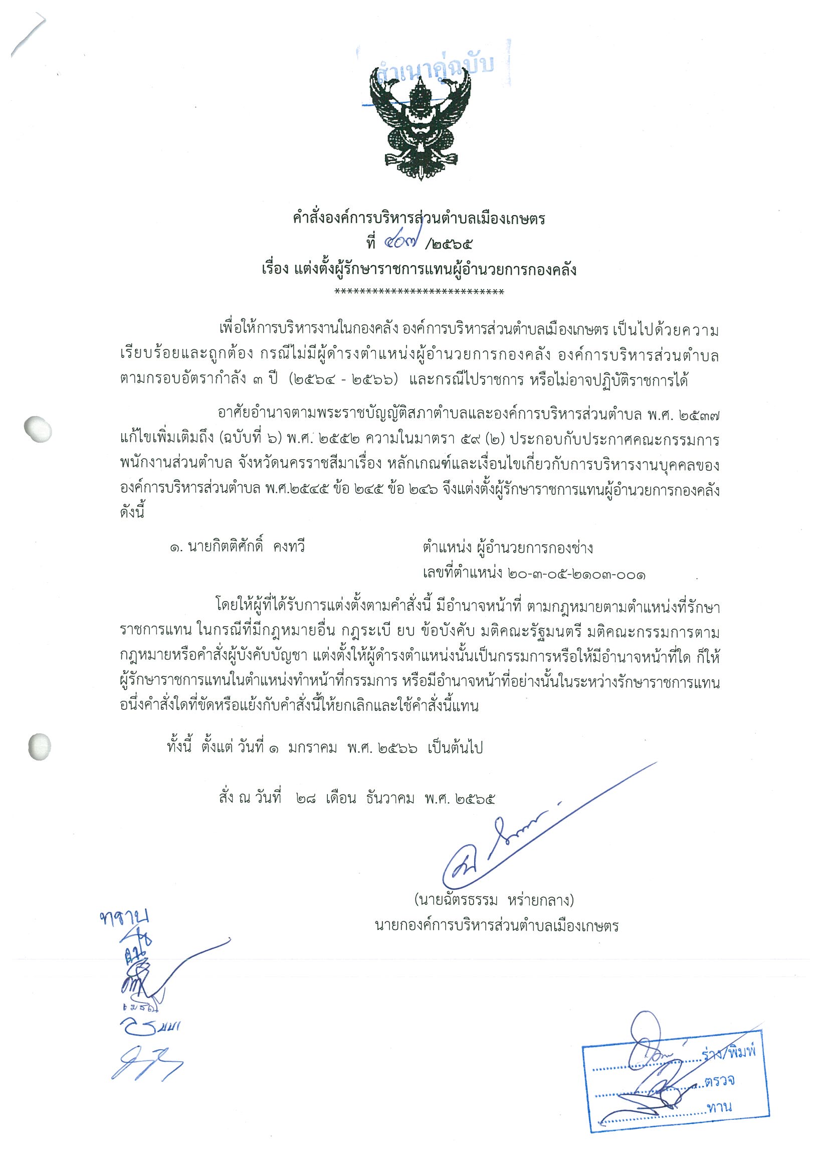 คำสั่งแต่งตั้งผู้รักษาราชการแทนผู้อำนวยการกองคลัง