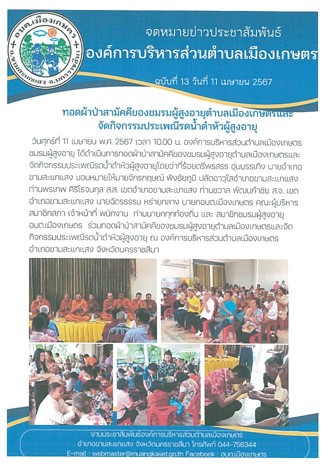 ทอดผ้าป่าสามัคคีของชมรมผู้สูงอายุ ตำบลเมืองเกษตรและจัดกิจกรรมประเพณีรดน้ำดำหัวผู้สูงอายุ