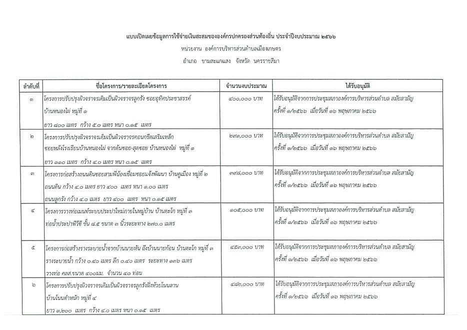 แบบเปิดเผยข้อมูลการใช้จ่ายเงินสะสมของ องค์กรปกครองส่วนท้องถิ่น ปีงบประมาณ 2566 อบต.เมืองเกษตร