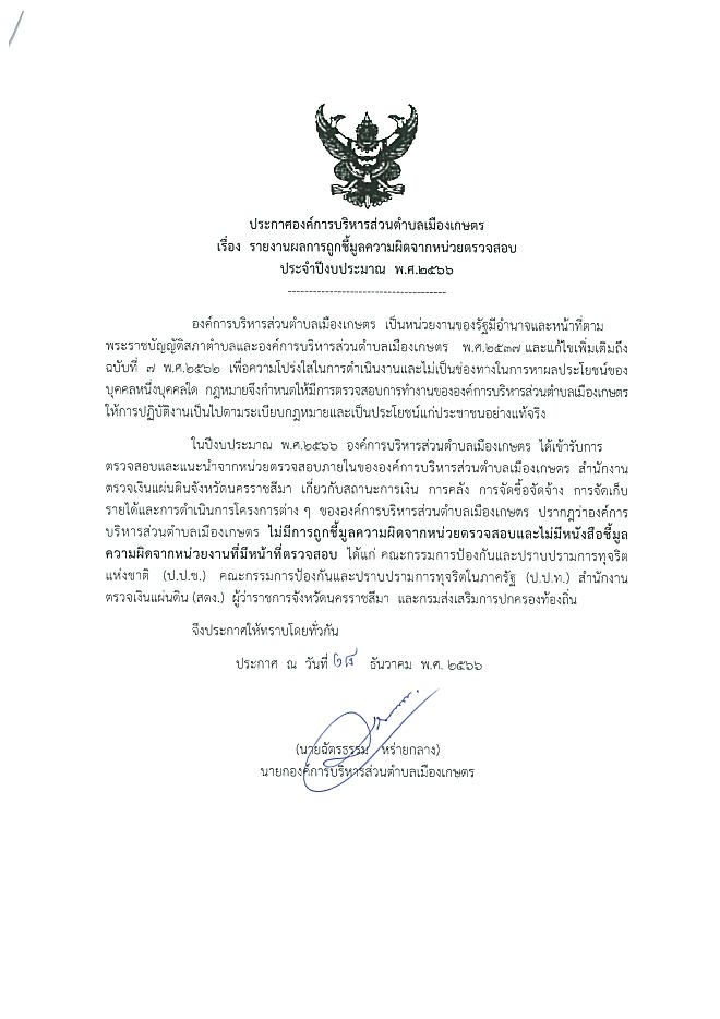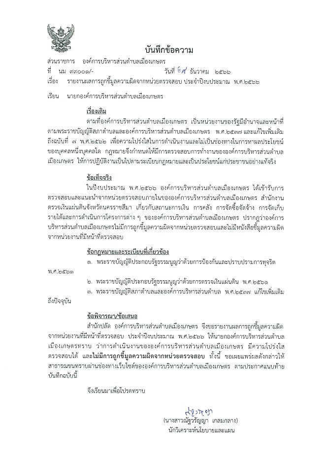 รายงานผลการถูกชี้มูลความผิดจากหน่วยตรวจสอบ ประจำปีงบประมาณ 2566