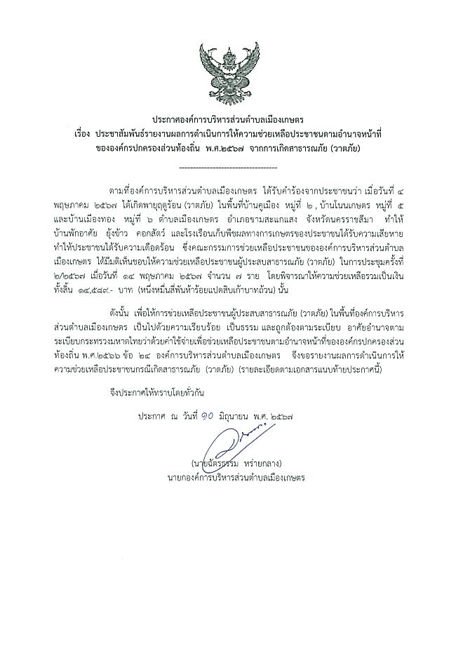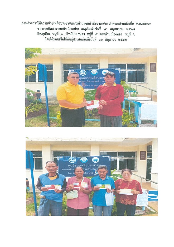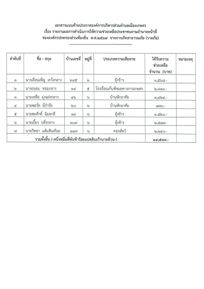 รายงานผลการดำเนินการให้ความช่วยเหลือประชาชนจากการดกิดสาธารณภัย (วาตภัย) ปี 2567