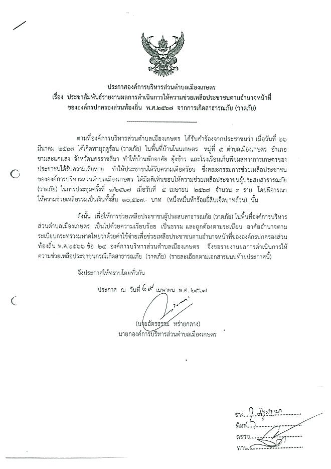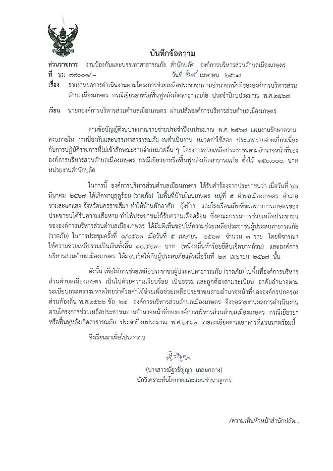 รายงานผลการช่วยเหลือประชาชนกรณีเยียวยาหรือฟื้นฟูหลังเกิดสาธารณภัย ปี 2567 29 เม.ย.67