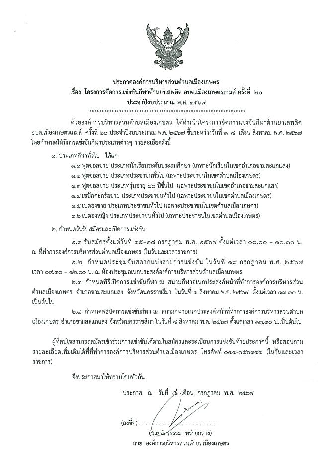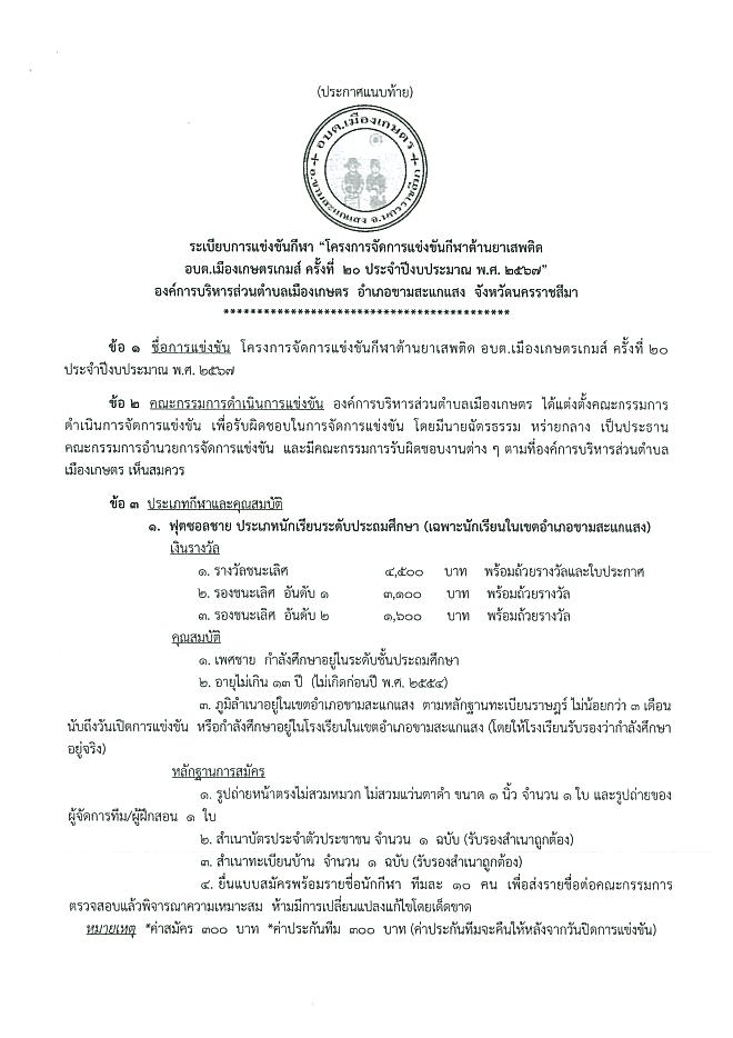 โครงการจัดการแข่งขันกีฬาต้านยาเสพติด อบต.เมืองเกษตรเกมส์ ครั้งที่ 20ประจำปี 2567