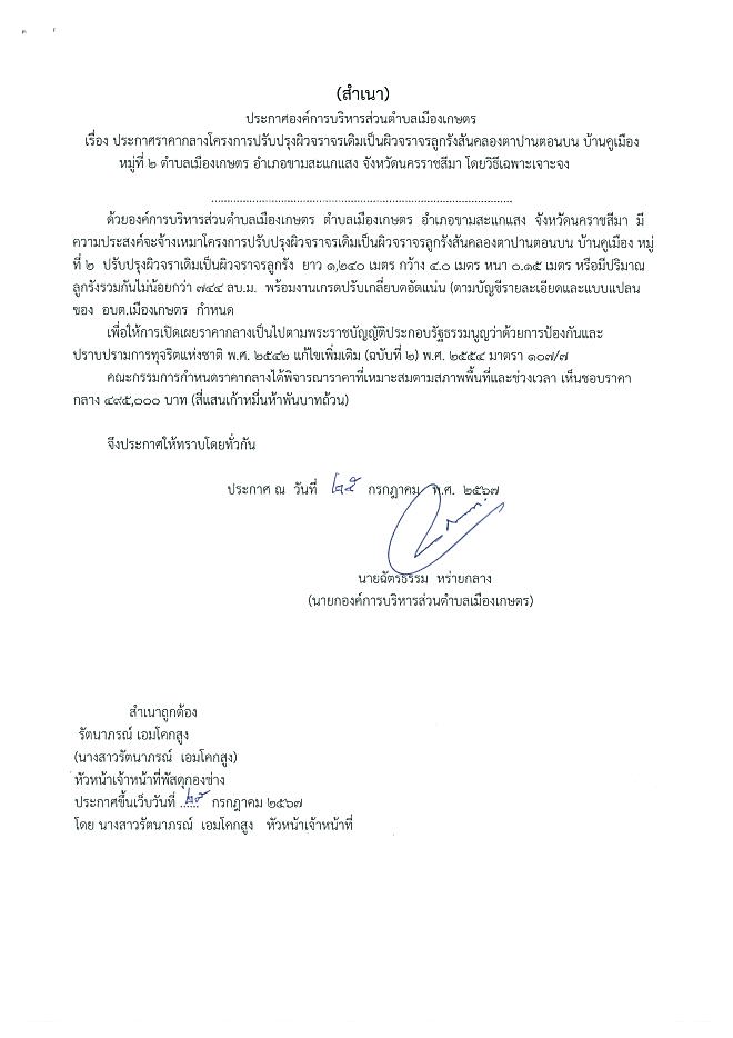 ประกาศราคากลางโครงการปรับปรุงผิวจราจรเดิมเป็นผิวจราจรลูกรังสันคลองตาปานตอนบน บ้านคูเมือง หมู่ 2