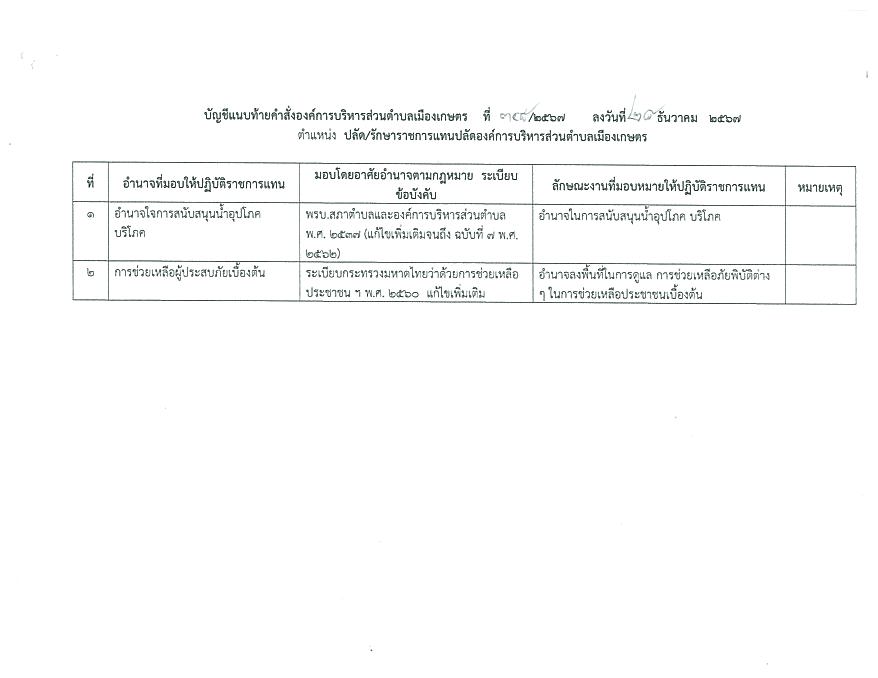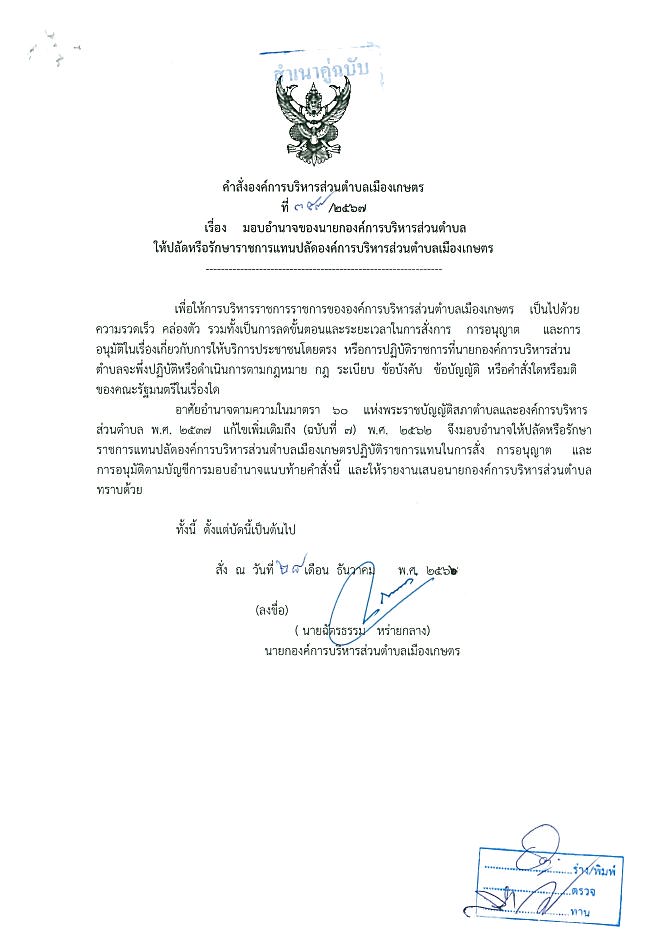 มอบอำนาจของนายกอบต.ให้ปลัดหรือรักษาราชการแทนปลัดอบต.เมืองเกษตร