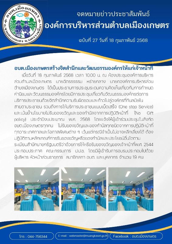 อบต.เมืองเกษตรสร้างจิตสำนึกและวัฒนธรรมองค์กรให้แก่เจ้าหน้าที่