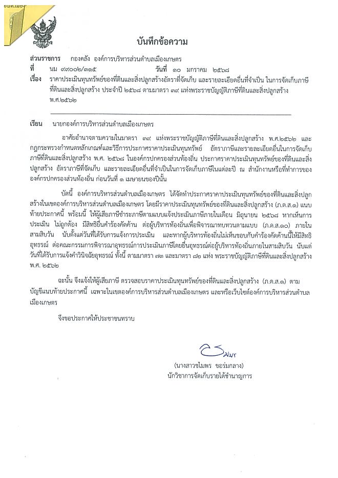 เรื่อง ราคาประเมินทุนทรัพย์ของที่ดินและสิ่งปลูกสร้างอัตราที่จัดเก็บ และรายละเอียดอื่นที่จำเป็น ในการจัดเก็บภาษีที่ดินและสิ่งปลูกสร้าง ประจำปี 2568 ตามมาตรา 39 แห่งพระราชบัญญัติภาษีที่ดิน