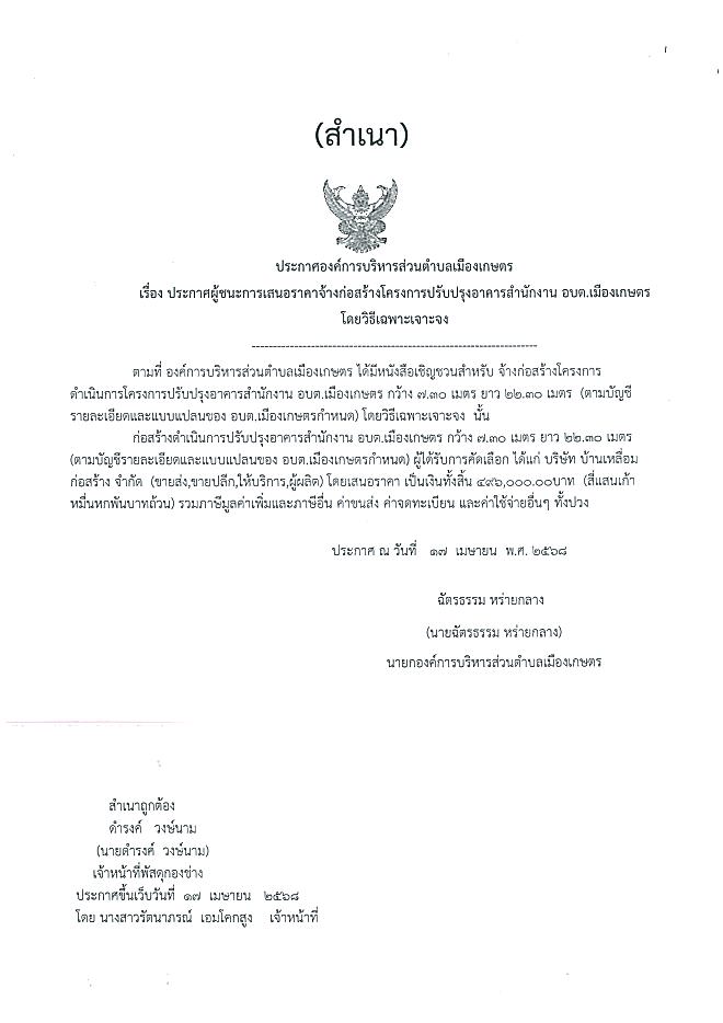 ประกาศผู้ชนะการเสนอราคาจ้างก่อสร้างโครงการปรับปรุงอาคารสำนักงาน อบต.เมืองเกษตร