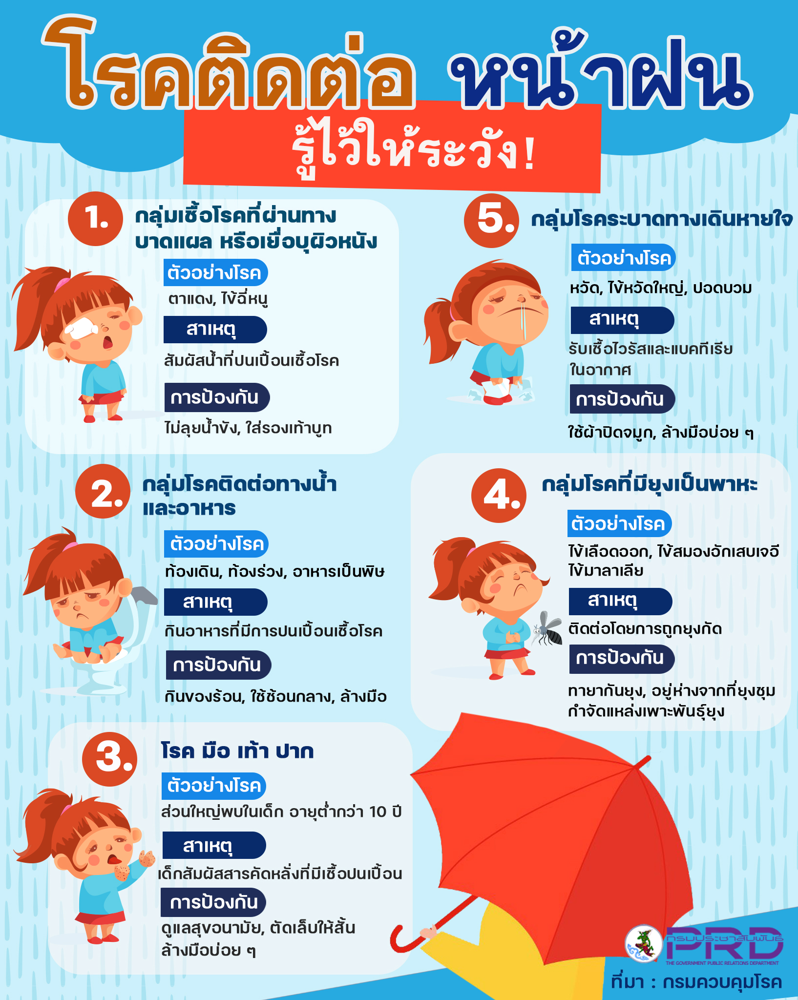ในฤดูฝน อากาศจะชื้น อุณหภูมิจะลดลงเป็นบางช่วง การแพร่ระบาดของโรคติดต่อก็มีมากขึ้นเพราะเชื้อโรคหลายชนิดเติบโตได้อย่างรวดเร็ว และเมื่ออากาศเปลี่ยน ภูมิคุ้มกันในร่างกายของเราอาจลดลงจนทำให้เมื่อมีการติดเชื้อจึงป่วยง่ายขึ้น ซึ่งโรคติดเชื้อที่มักมากับหน้าฝนนั้น เกิดขึ้นได้กับหลายระบบของร่างกาย เช่น