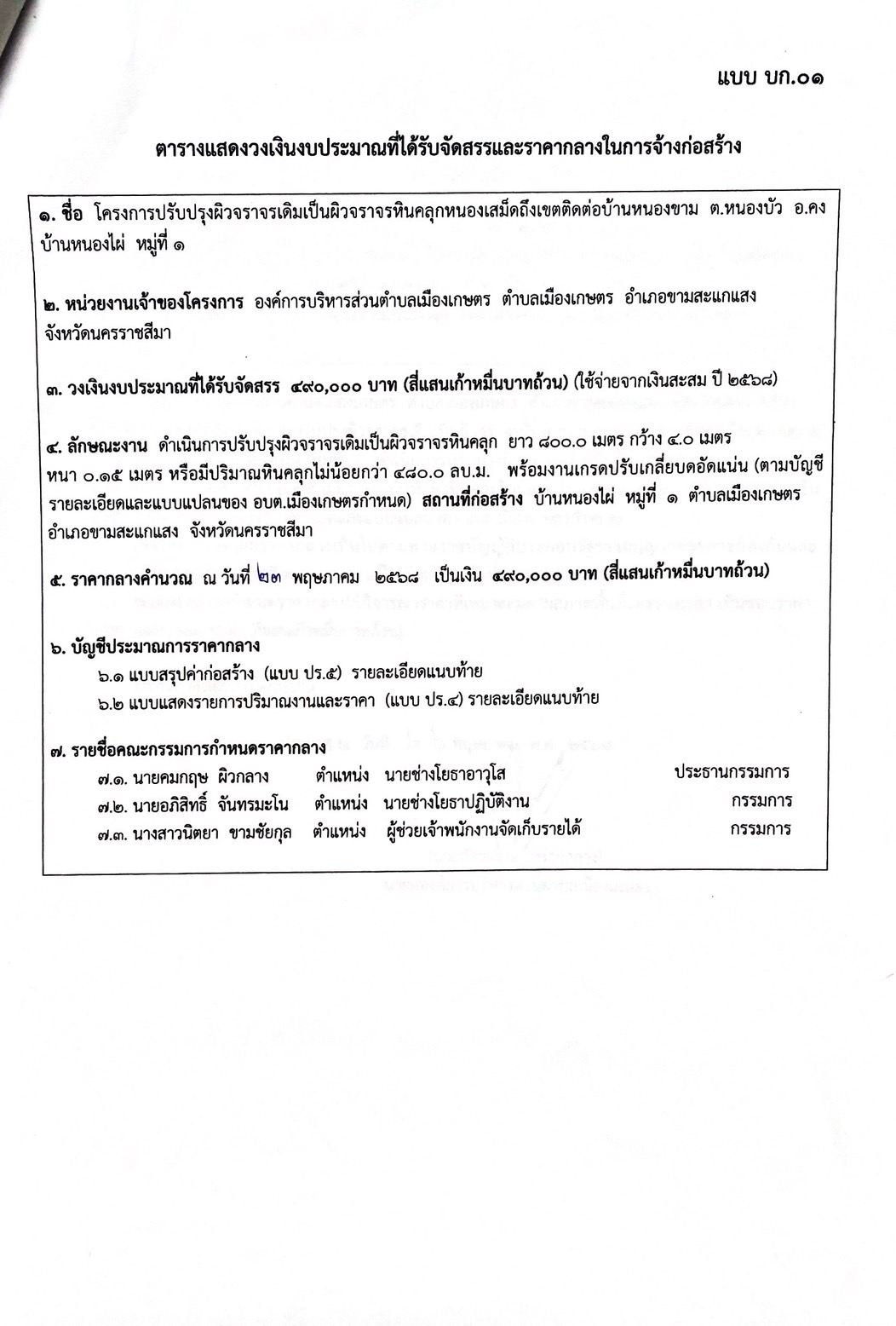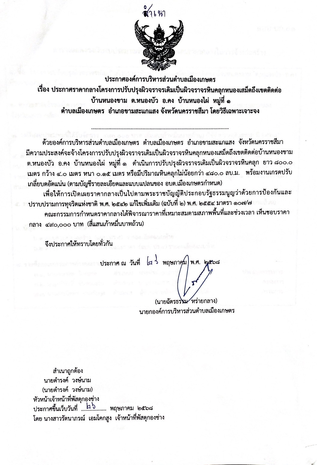 ประกาศเผยแพร่ผู้ชะการเสนอราคาโครงการปรับปรุงผิวจราจรเดิมเป็นผิวจราจรหินคลุกหนองเสม็ดถึงเขตติดต่อบ้านหนองขาม ต.หนองบัว อ.คง บ้านหนองไผ่ หมู่ที่ 1