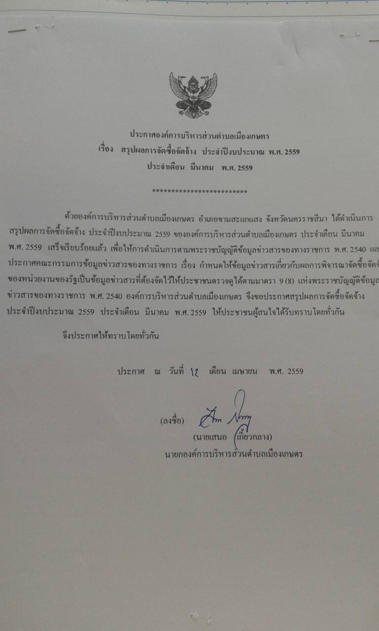 ประกาศสรุปผลการจัดซื้อจัดจ้างเดือนมีนาคม 2559