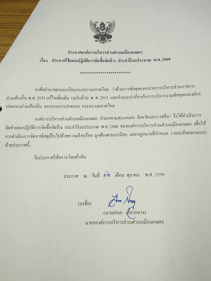 ประกาศการใช้แผนปฏิบัติการจัดซื้อจัดจ้าง ปี 2560